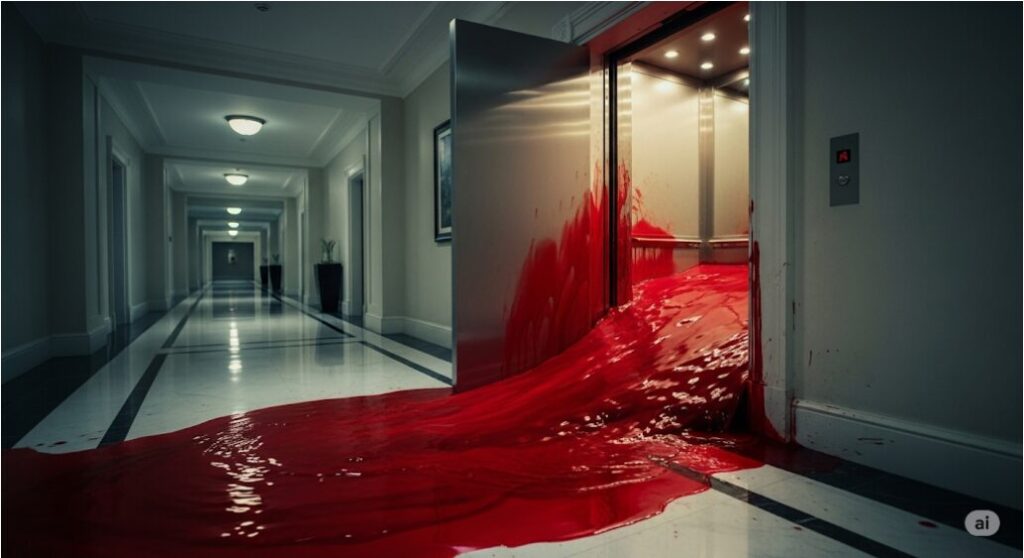 作中で語られるように、このホテルはインディアンの墓地の上に建てられたという暗い過去を持ち、さらに前任の管理人チャールズ・グレイディによる一家惨殺事件も起きています。エレベーターから溢れ出す血は、これらの血塗られた歴史や、ホテルの中で犠牲になった数多の魂の怨念が、物理的な形となって現れたものと解釈できます。